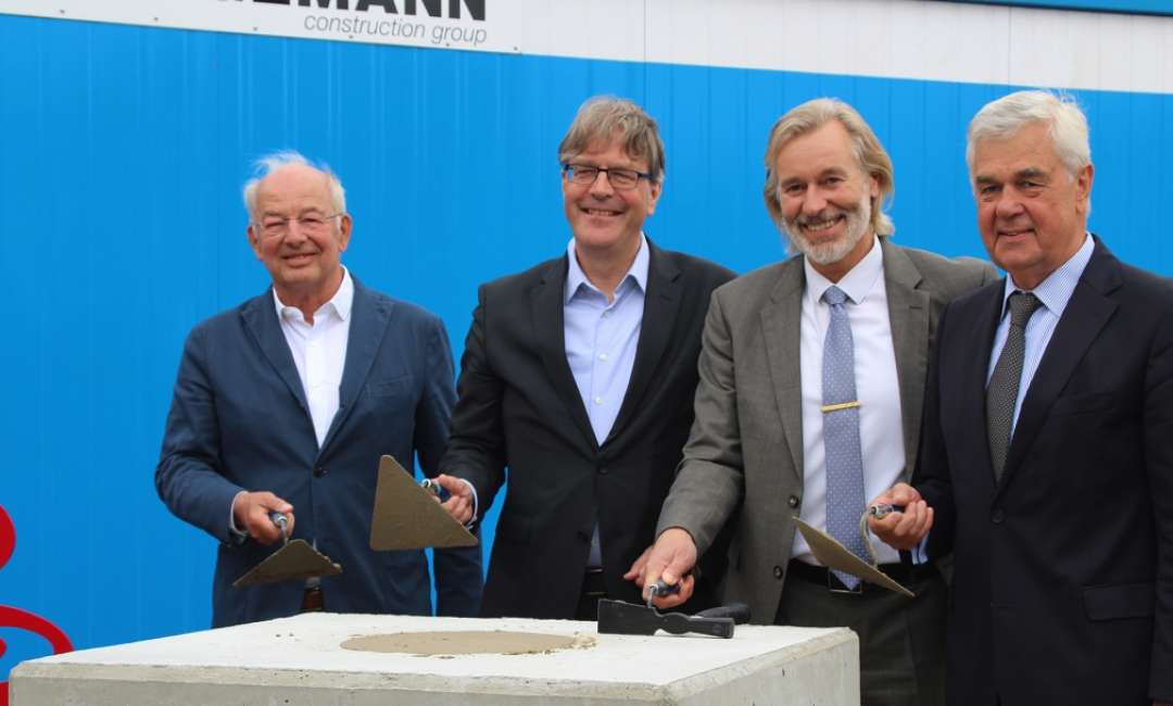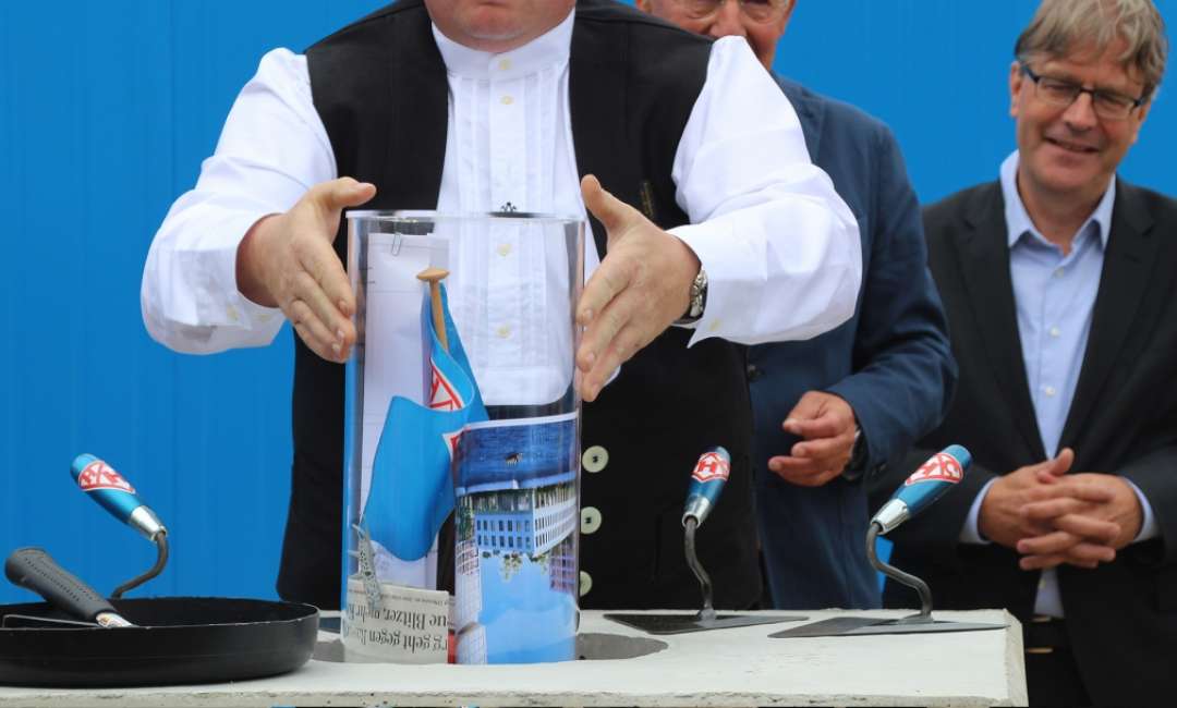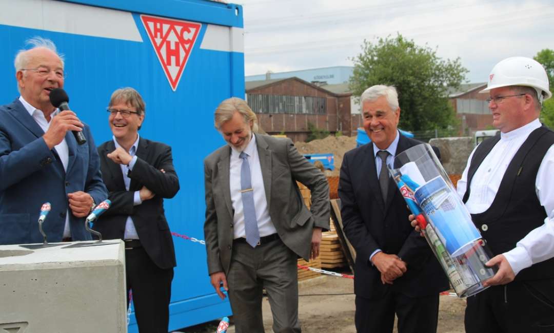 Senator Frank Horch, Arne Weber, Investor und Geschäftsführer der HC Hagemann GmbH & Co. KG, Dierk Trispel, stellv. Bezirksamtsleiter Harburg und Prof. Dr. Ed Brinksma, Präsident der TUHH, haben gemeinsam den Grundstein für den neuen Innovationspark gelegt. In der traditionellen Zeremonie wurden neben Bauplänen, der Tageszeitung und einigen Münzen auch ein Mini-Reaktor aus dem Studiendekanat Verfahrenstechnik und ein Reagenzglas mit dem in der TUHH erfundenen leichtesten Material der Welt in den Grundstein gelegt.