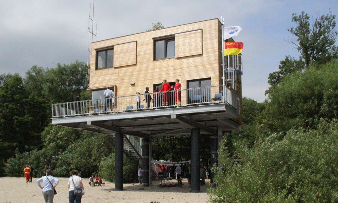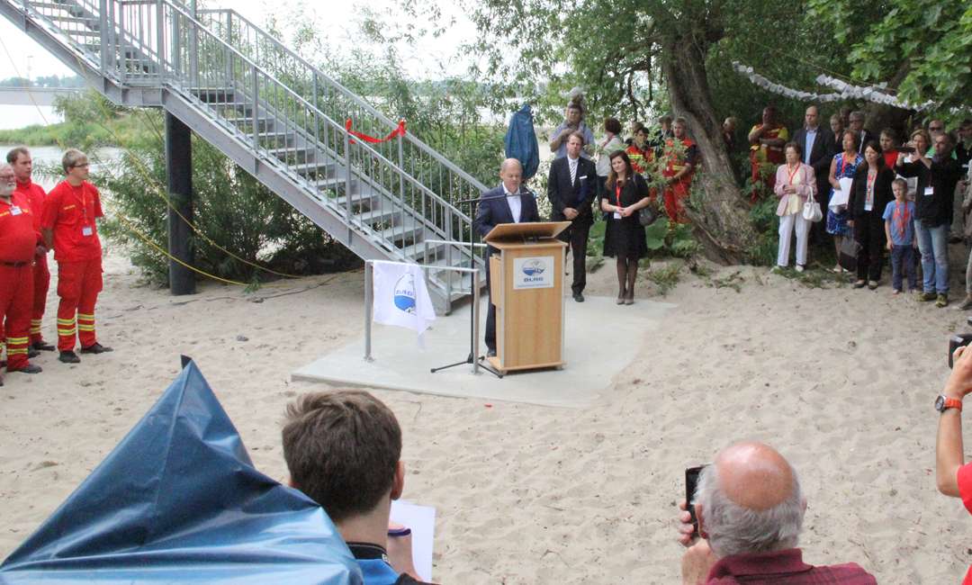 Jetzt kann beruhigt in die Strandsaison an der Elbe gestartet werden – die neue Wasserrettungsdienst-Station wurde am Samstag, 27. Juni 2015, in Anwesenheit von Hamburgs Ersten Bürgermeister Olaf Scholz offiziell an die DLRG übergeben.