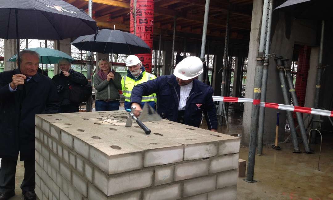 Die Tochter von Inhaber Jan Beernd Rothfoss mauerte, unterstützt von HCH-Polier Matthias Jasper, eine Schatulle mit den obligatorischen Architektenplänen, der Tageszeitung und einem Glas Kaffee in einen Steinblock ein. Anschließend sprach Herr Rothfoss zu den ca. 30 anwesenden Gästen. Er drückte seine Zufriedenheit über die Ausweitung des Standortes in Wilhelmsburg und die damit verbundene Sicherung der Arbeitsplätze in der Region aus. In diesem Zusammenhang äußerte er sich sehr glücklich darüber, dass man mit HC Hagemann ein lokales Bauunternehmen für die Bauausführung gewinnen konnte. HCH-Oberbauleiter Oliver Kufeke überreichte im Anschluss ein Kunstwerk als Geschenk an den Bauherrn und gratulierte, im Namen von HC Hagemann, zur erfolgreichen Grundsteinlegung. Daraufhin wurden alle Baubeteiligten großzügig zu Speis und Trank in die Kantine von der DEK eingeladen.