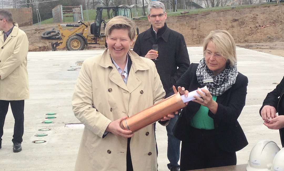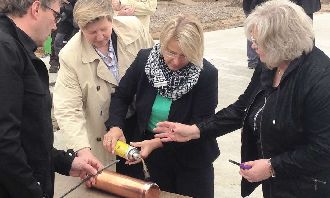 Kristin Adelheit, Ministerin für Soziales, Gesundheit, Wissenschaft und Gleichstellung des Landes Schleswig-Holstein, war sichtlich gut gelaunt, als sie am 5. April 2016 den symbolischen Grundstein für das Studentenwohnheim in Flensburg legte. In eine Aussparung in der Sohle wurde eine Schatulle mit den Architektenplänen und der aktuellen Tageszeitung eingelassen und anschließend von der Ministerin eigenhändig vermörtelt.