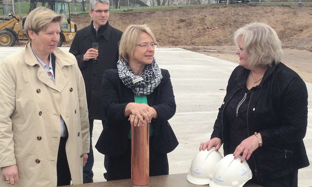 Zuvor hatte bereits Susann Schrader, Geschäftsführerin des Studentenwerks Schleswig-Holstein, die etwa 60 Gäste begrüßt. Diese bestanden aus Vertretern der Kommunen, der Studierenden und der baubeteiligten Unternehmen. Nach einem weiteren kurzen Grußwort der Ministerin wurde die Grundsteinlegung gemeinsam mit dem Architekten Herrn Blad und Frau Dürkoop vom Studentenwerk vollzogen. Alle Sprecher brachten ihre Freude und Zuversicht ob des anstehenden Bauvorhabens zum Ausdruck.
