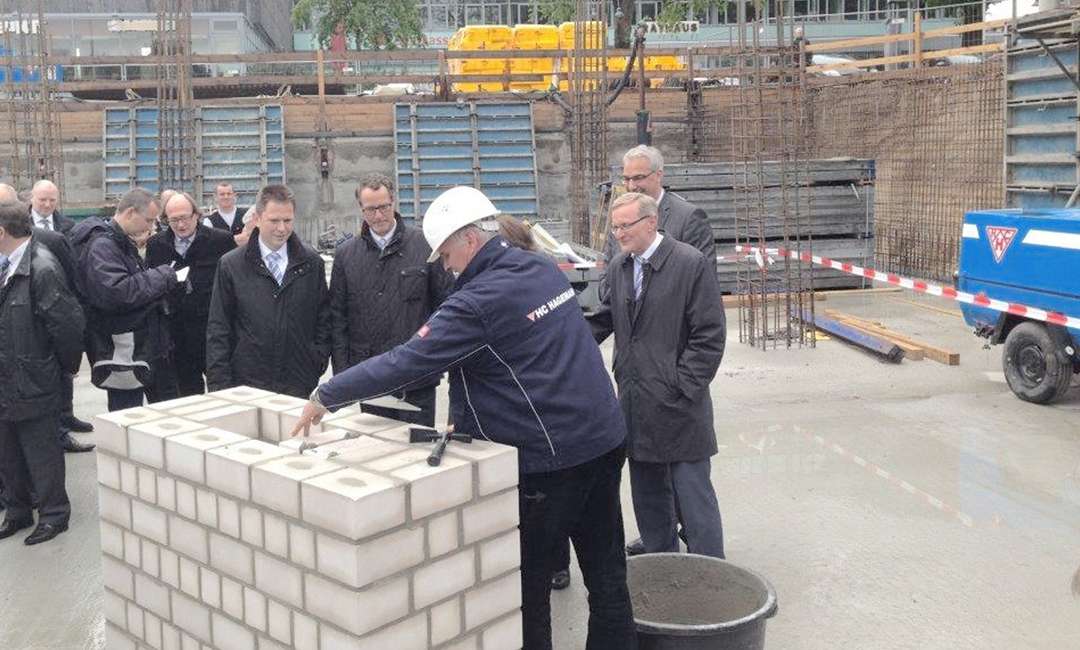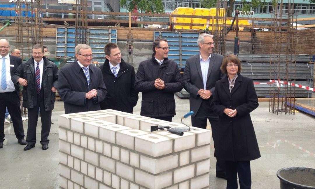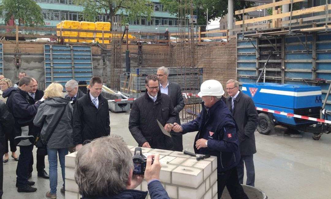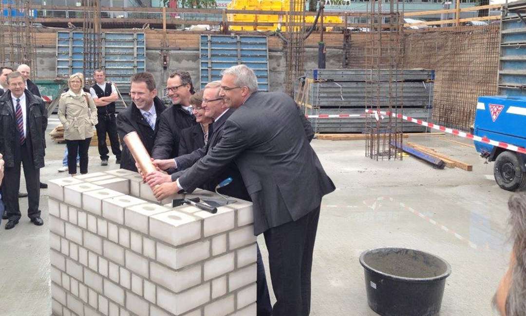 Erfreut über den reibungslosen Fortschritt des Neubaus, legten die Bauherren und die Pinneberger Politik am Freitag, 29. Mai 2015, den Grundstein – ab jetzt wird nach oben gebaut.