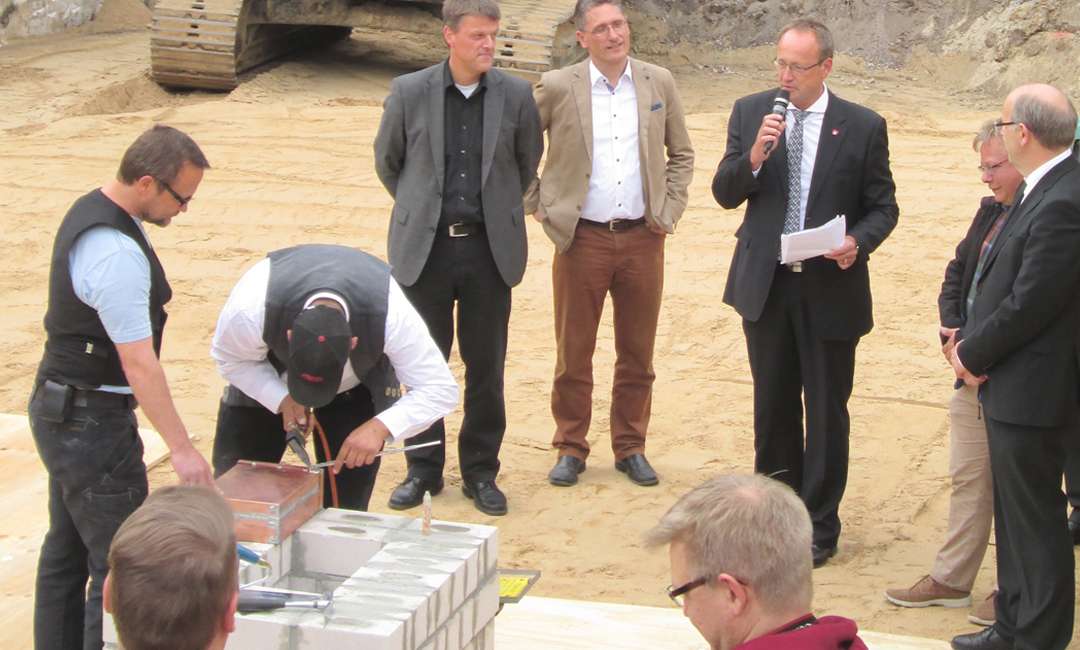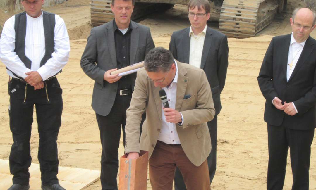 Bauherrenvertreter des Kirchlichen Zentrums, Bischof Gothart Magaard, Bürgermeister Volker Hatje und Handwerker ließen vergangenen Donnerstag, 25. Juni, symbolisch eine Schatulle mit Bibel, einem Gebäudegrundriss und Tageszeitungen in die Baugrube an der Elmshorner Kirchenstraße ein.