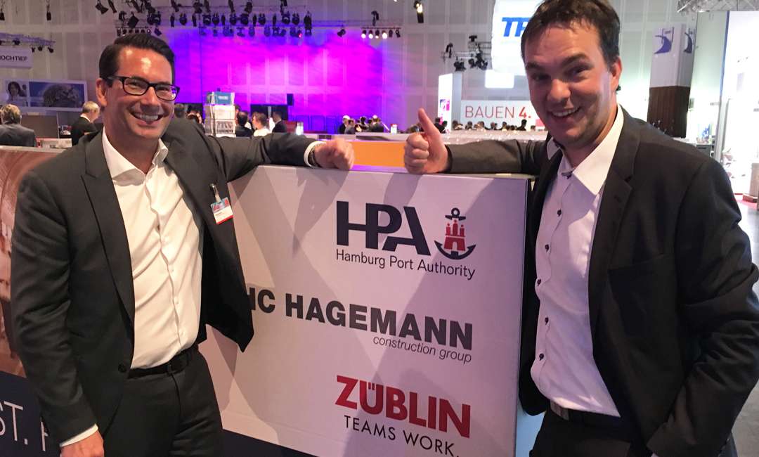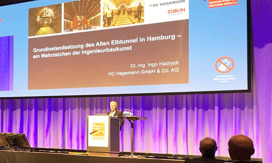 An einem gemeinsamen Themenstand präsentierte HC HAGEMANN gemeinsam mit der dem Auftraggeber HPA (Hamburg Port Authority) die Baustelle „Grundinstandsetzung Oströhre St. Pauli Elbtunnel Hamburg“, an der das Bauunternehmen in Arbeitsgemeinschaft mit Züblin mit Unterbrechungen seit 2010 im Einsatz ist. Herr Dr.-Ing. Ingo Hadrych hielt zudem im Fachprogramm einen Vortrag über die herausfordernde Grundinstandsetzung dieses Wahrzeichens der Ingenieurbaukunst.