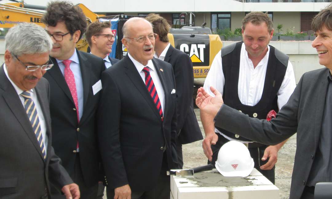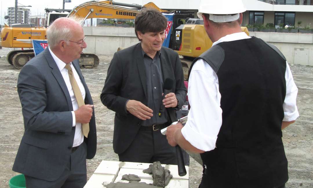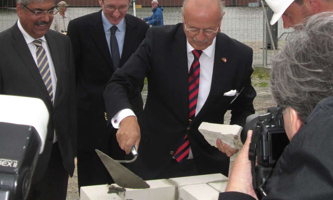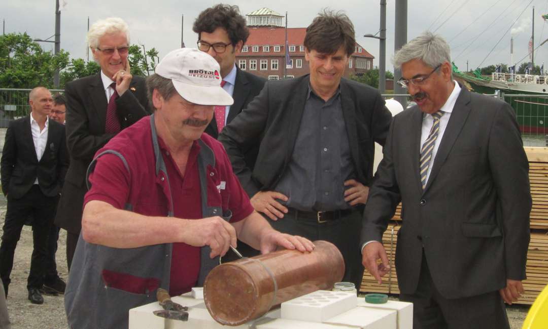 Vergangenen Freitag feierte der Hamburger Hotelier Hans Gerst die Grundsteinlegung für das neue Liberty Hotel neben dem Deutschen Auswandererhaus. Bei guter Stimmung wurde der Grundstein im Beisein von Architekt Andreas Heller sowie zahlreicher Repräsentanten aus Wirtschaft, Verwaltung und Politik von Oberbürgermeister Melf Grantz eingemauert. HC HAGEMANN Polier Thorsten Zierke assistierte. Im Festzelt gingen zuvor mehrere Redner auf das ehrgeizige Projekt ein.