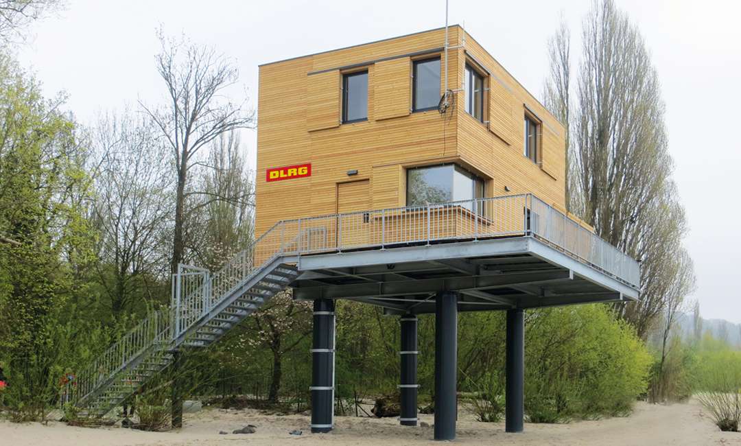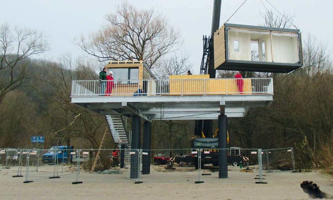 Die örtliche Baumaßnahme wurde von Januar bis April diesen Jahres durchgeführt. Zuerst wurden die vier Gründungsrohre in den Boden eingebracht. Anschließend wurde die im HC HAGEMANN-Stahlbau erstellte Stahltragrahmenkonstruktion inklusive Zugangstreppe und Geländer vor Ort montiert. Im nächsten Schritt konnte die schlüsselfertige Containeranlage mit acht Einzelcontainern auf der Rahmenkonstruktion montiert und entsprechend den gewünschten Vorgaben final ausgebaut werden. Abschließend erfolgte die Installation einer WPC-Bedielung im Bereich des Beobachtungsdecks. Die neue Station wurde vollumfänglich an das öffentliche Versorgungs- und Mediennetz angeschlossen.