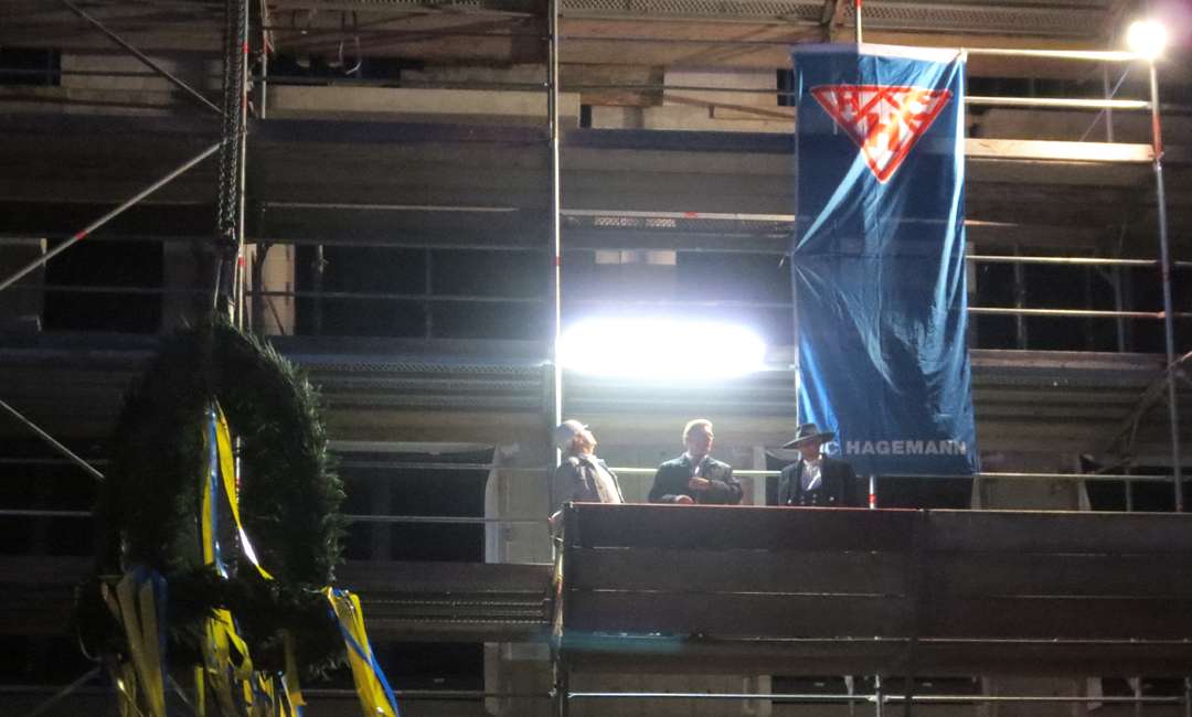 Auf die offiziellen Reden folgte der traditionelle Richtspruch von HC HAGEMANN Polier Ingo Grantz. Dieser hob hoch oben am Gebäude sein Glas, warf es in hohem Bogen über seine Schulter und beendete damit seinen Richtspruch: „Zerschmettere – Glas, am Grunde! Geweiht ist dieser Bau zur Stunde.“