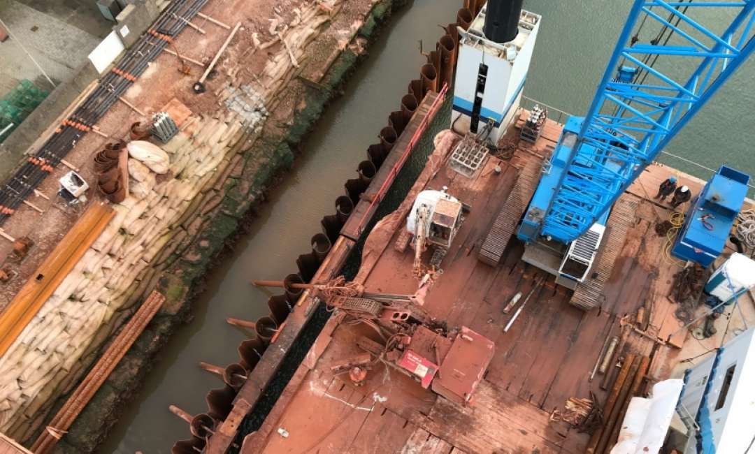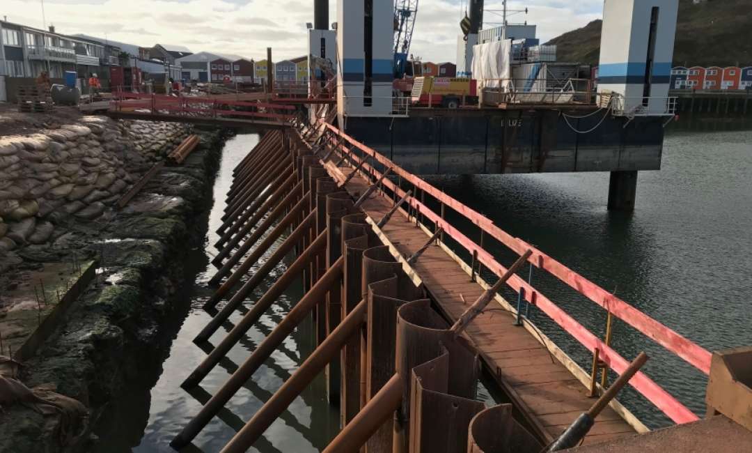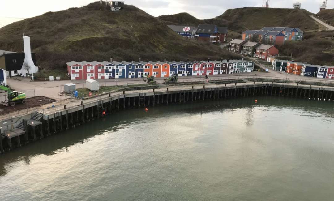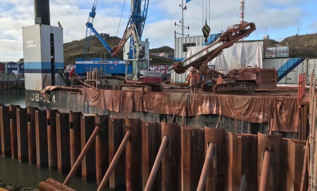 Auf unserer Baustelle in Binnenhafen auf Helgoland (im Herzen der Insel, vor den Hummerbuden) laufen aktuell die Rückverankerungsarbeiten der neuen Uferwand. Von einer Hubinsel aus werden 51 Gewi-Pfähle mit Schutzrohren im Trockenbohrverfahren in den Helgoländer Fels eingebaut. Anschließend erfolgt die Verbindung zur bereits fertig gestellten „Gemischten Rohrwand“ mittels Stahlbauanschluss. Ab Anfang März wird dann die komplett rückverankerte Wand vollständig verfüllt sein.