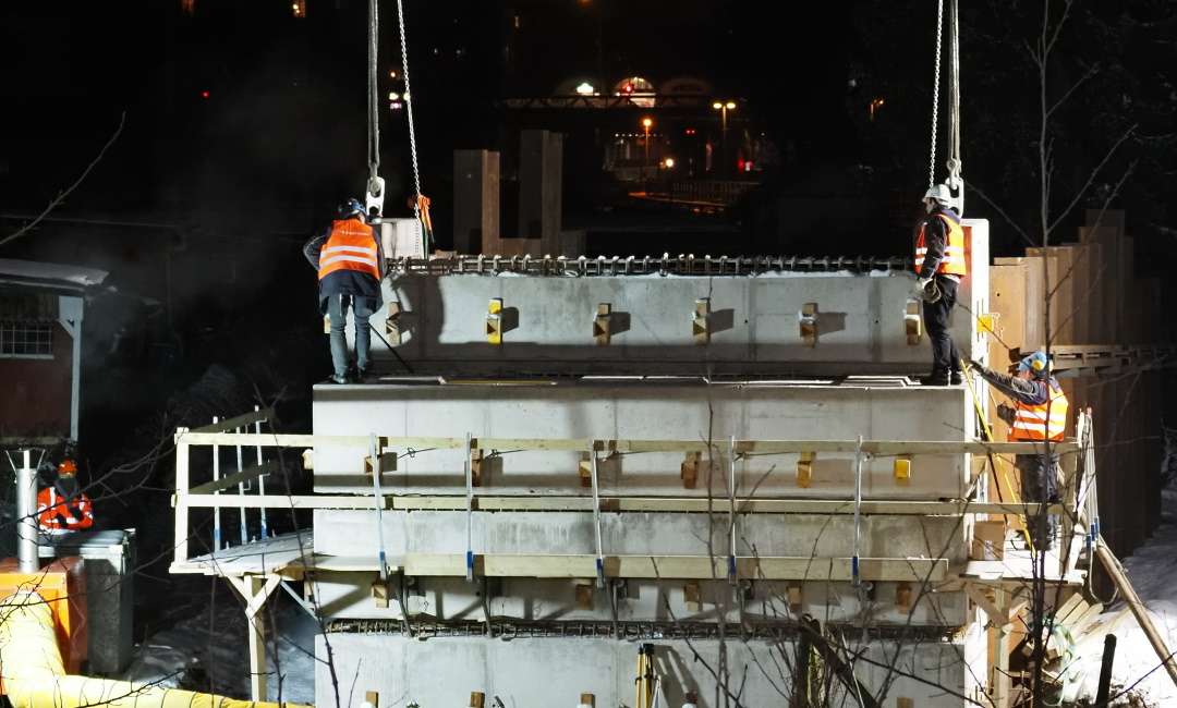 Bauphase 3: Anlieferung Behelfsbrücke und Vormontage auf BE Fläche Hammer Straße, Einhub Fertigteile für das WL West und der Behelfsbrücke mit einem 850 to Autokran