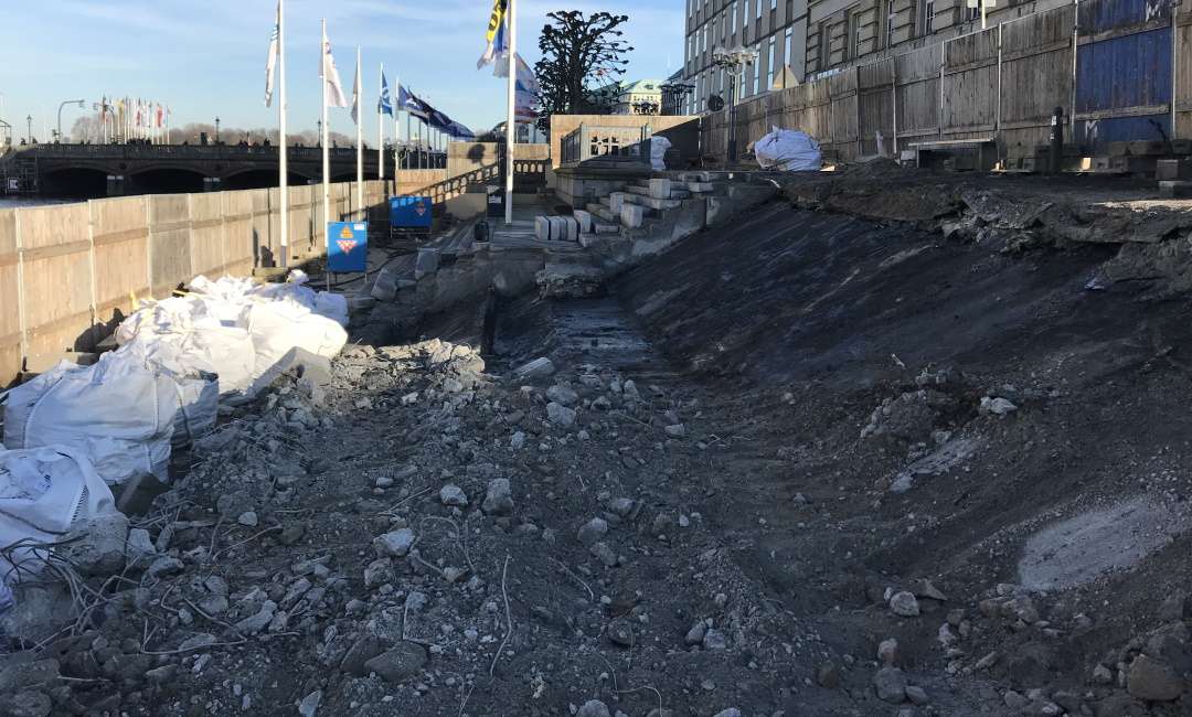 Im Zuge der Umgestaltung der Rathauspassage unterhalb des Rathausmarktes erfolgte eine bauliche Erweiterung bestehend aus einem Fassaden- und Deckelbereich entlang der kleinen Alster von ca. 24m Länge. Hier wurde die vorhandene Freitreppe abgebrochen und durch eine Fortführung der Kaimauer mit hochwassersicheren Fenstern, sowie einem dazugehörigen Deckel als Erweiterung des Rathausmarkts erstellt. Die innenliegenden restlichen und neu entstandenen Flächen werden später neu ausgebaut. Die Anschlusspunkte der neuen baulichen Konstruktion an die bestehende erfolgte mit großer Sorgfalt und durch Einbinden eines Abdichtungssachverständigen, in Zusammenarbeit mit Statikern und Architekt. Hier wurde das vorhandene System einer schwarzen Abdichtung, die das Bauwerk umfasst fortgeführt und an den speziellen Punkten wie Fenster und Eingänge angebunden. Zusätzlich wurden in den beiden späteren Zugängen zum
