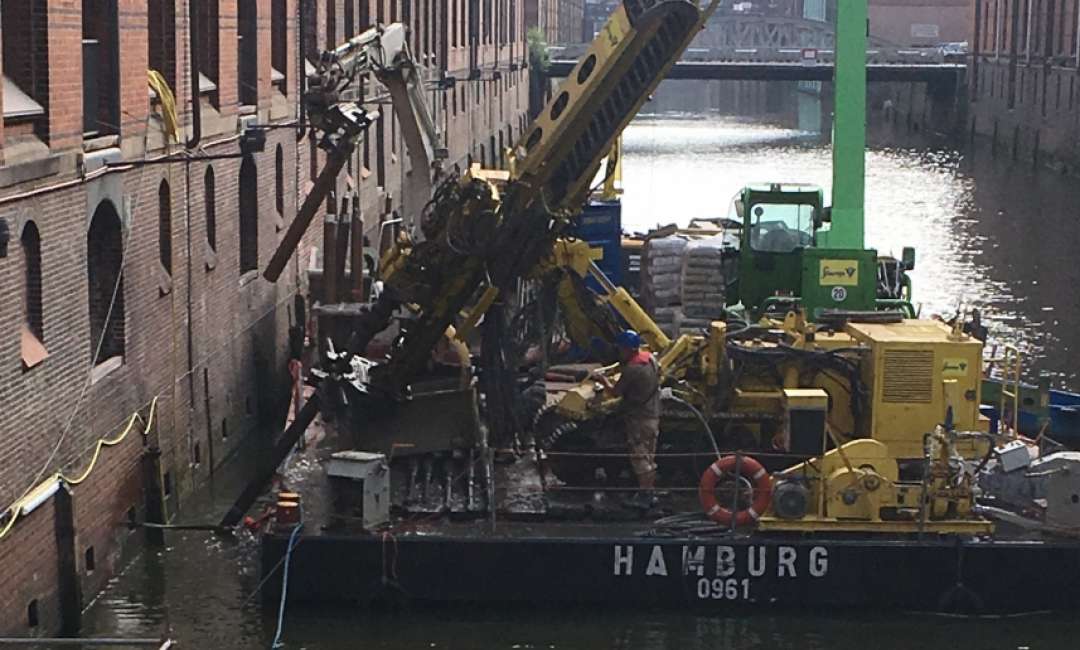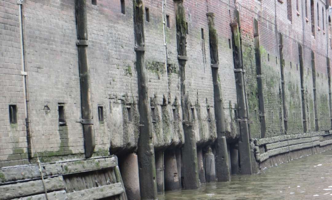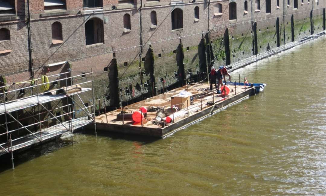 Der Auftrag der ReGe – Hamburg beinhaltete die Instandsetzung der wasserseitigen Kaimauer, auf der der Speicher D6 aufl agert. Die Baustelle befi ndet sich im Kehrwiederfl eet in der Hamburger Speicherstadt. Diese ca. 21 m lange Kaimauerkonstruktion bestehend aus einer auf Pfählen tiefgegründeten Stahlbetonwinkelstütze, stellt in der Speicherstadt Hamburg eine Besonderheit dar, da dieser Bereich als einziger nach dem II. Weltkrieg aufgrund vollständiger Zerstörung neu wiederaufgebaut werden musste. Die große Herausforderung bei der Instandsetzung der Kaimauer war es, die Leistungen im untersten Tideniedrigwasserbereich durchzuführen.